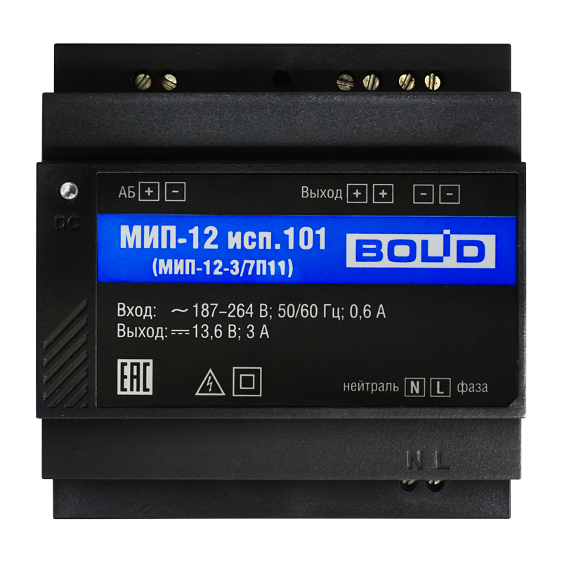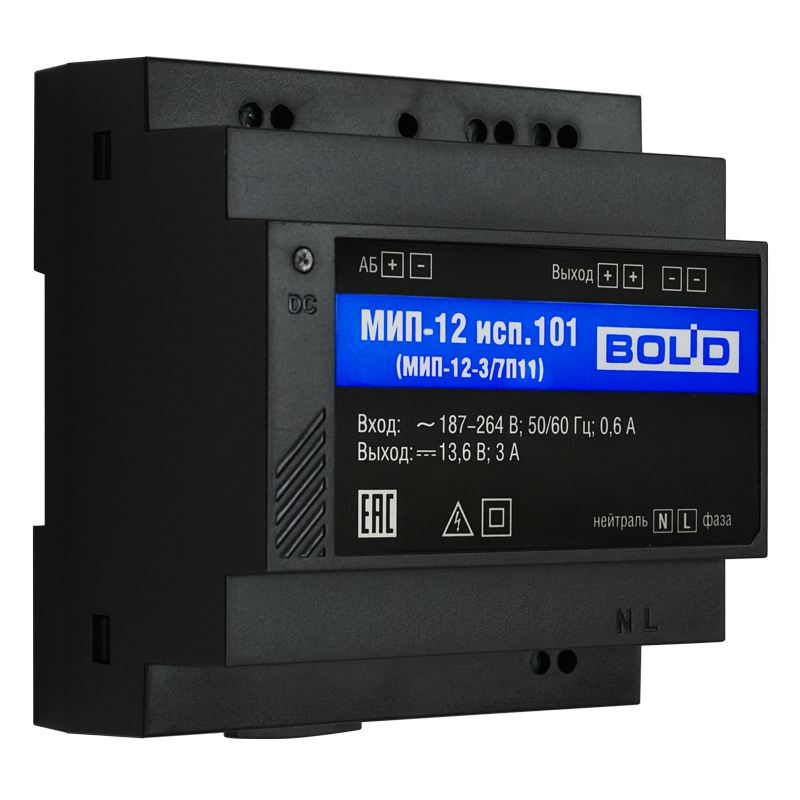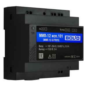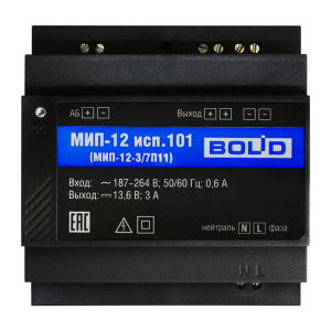 Резервированный источник питания; U-вх.187…264 В, U-вых.13.6±2% В, I-max.3 А, под внешний АКБ 12 В 4.5…12 А·ч; световая индикация, электронная защита от короткого замыкания, защита аккумулятора от глубокого разряда; IP20, t-раб.-20…+45°С, 89,5×95×56 мм. Крепление на DIN-рейку.