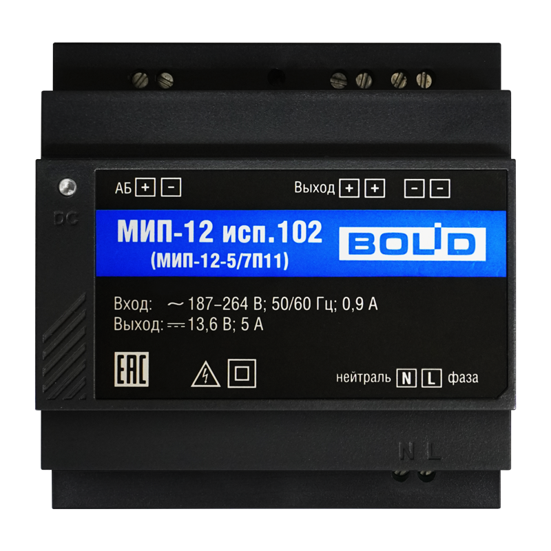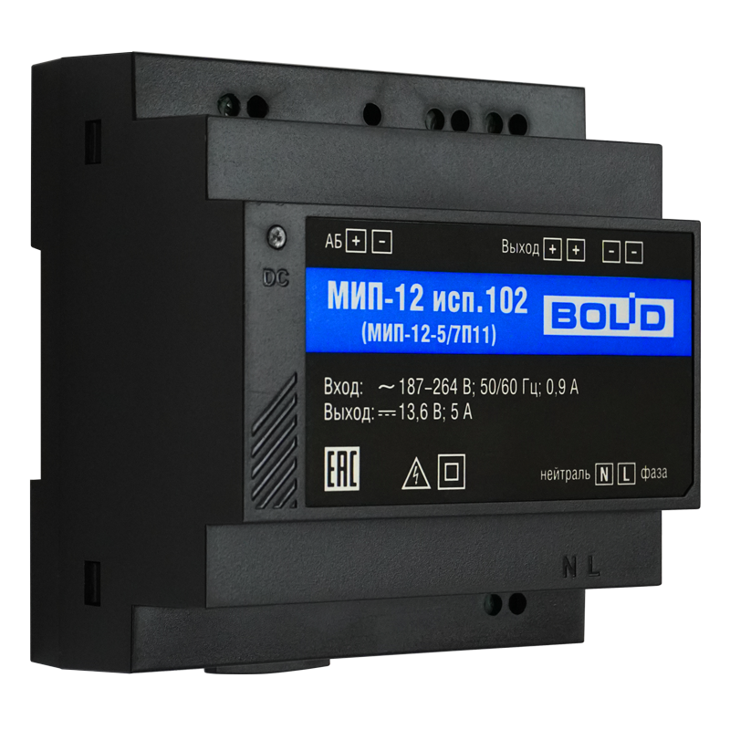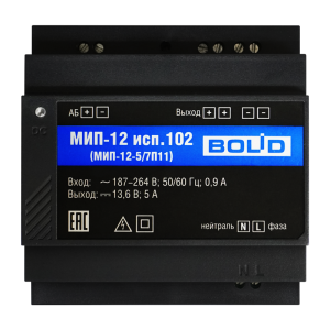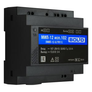 Резервированный источник питания; U-вх.187…264 В, U-вых.13.6±2% В, I-max.5 А, под внешний АКБ 12 В 4.5…12 А·ч; световая индикация, электронная защита от короткого замыкания, защита аккумулятора от глубокого разряда; IP20, t-раб.-20…+45°С, 89.5×95×56 мм. Крепление на DIN-рейку.