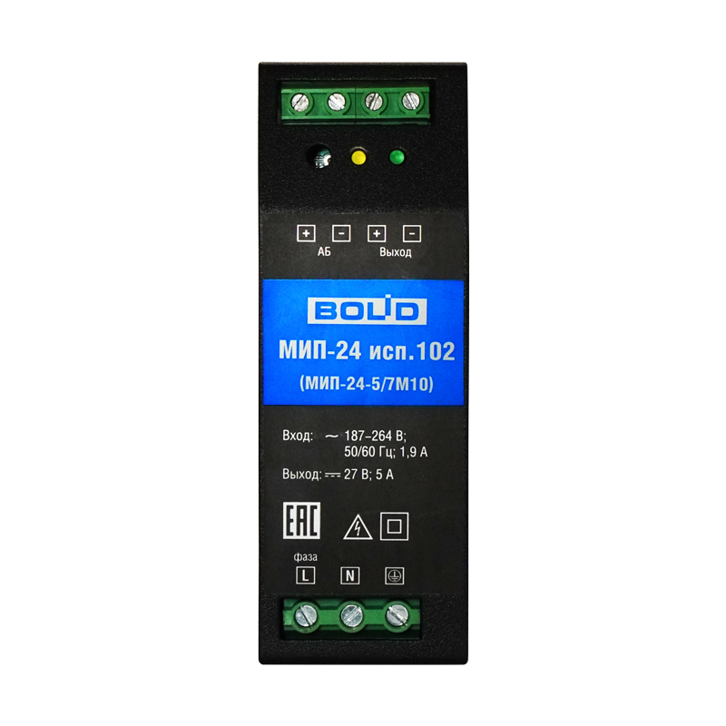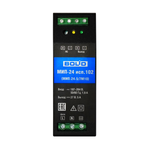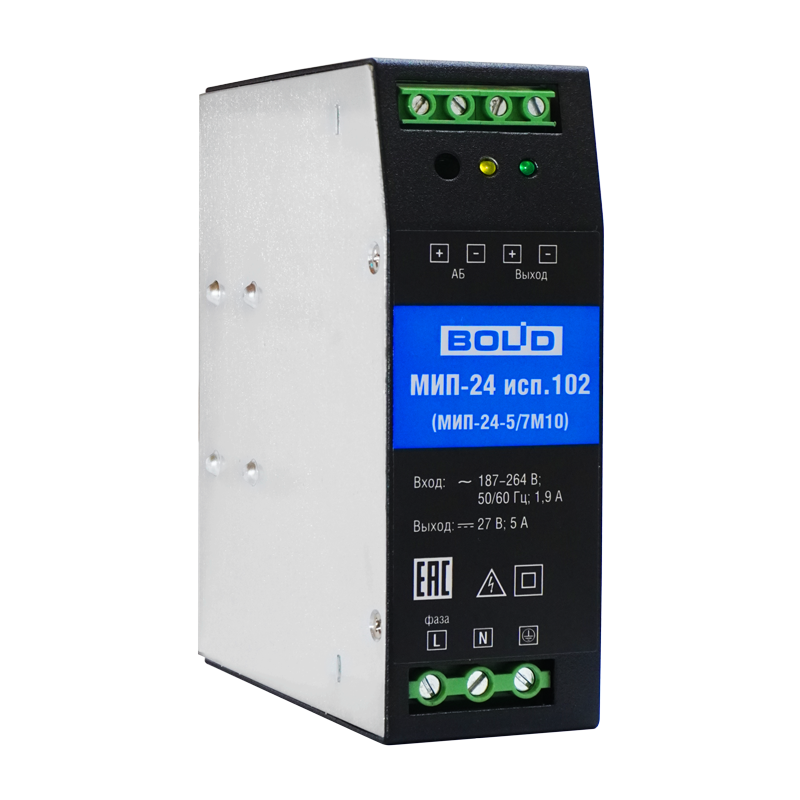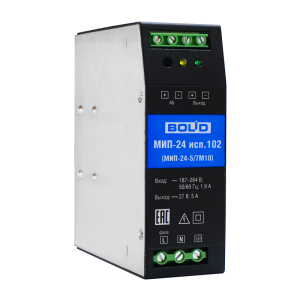 Резервированный источник питания; U-вх.187…264 В, U-вых.27±2% В, I-max.5 А, под два внешних АКБ 12 В 4.5…12 А·ч; световая индикация режимов работы, электронная защита от короткого замыкания, защита аккумулятора от глубокого разряда; IP20, t-раб.-20…+45°С, 43×124×113 мм. Крепление на DIN-рейку.