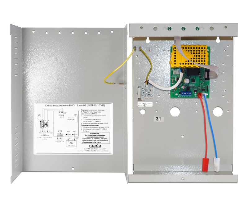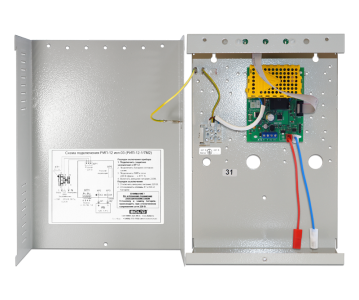Резервированный источник питания; U-вх.187…242 В, U-вых.13…14.2 В, I-ном.1 А, I-max.1,3 А (до 10 минут), под АКБ 12 В 7 А·ч; световая индикация режимов работы, защита от короткого замыкания, защита аккумулятора от глубокого разряда; IP30, t-раб.-10…+40°С, 220х200х80 мм