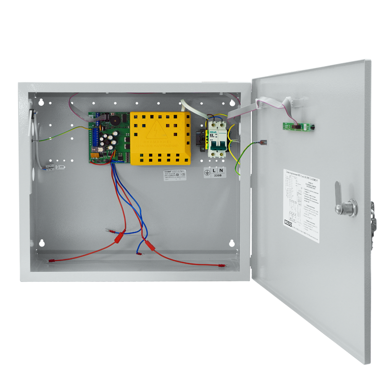 Резервированный источник питания; U-вх.150…253 В, U-вых.13±0.6 В, I-ном.6 А, I-max.8 А (до 2 минут), под два АКБ 12 В 26 А·ч или 12 В 40 А·ч; световая и звуковая индикация режимов работы, три оптоэлектронных диагностических выхода, защита от короткого замыкания, защита аккумулятора от глубокого разряда, тампер; IP30, t-раб.-10…+40°С, 450х400х210 мм