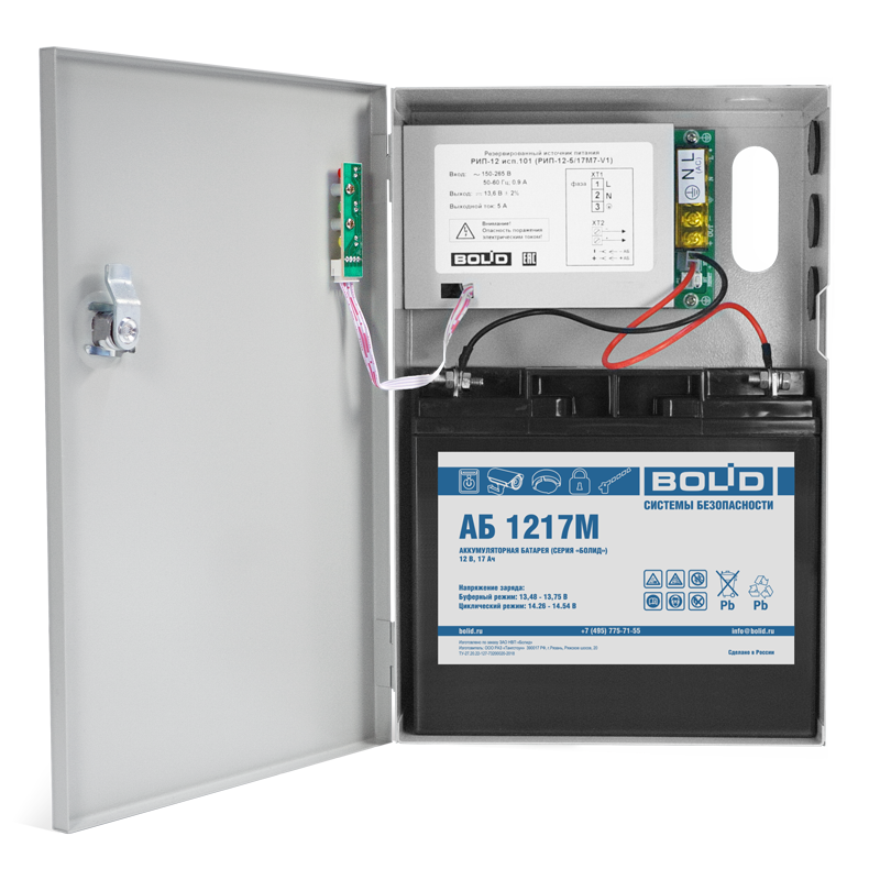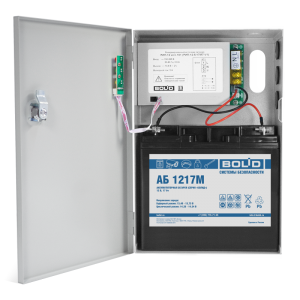 Резервированный источник питания; U-пит.150…265 В, U-вых.13.6 В, I-вых.5 А; под АКБ 12 В 17 А·ч; защита от КЗ и глубокого разряда; IP30, t-раб.-10…+40°С, 295х195х90 мм