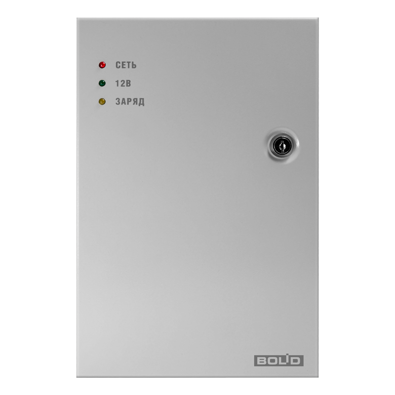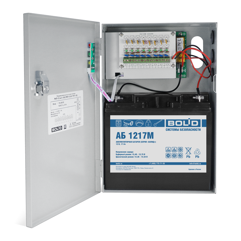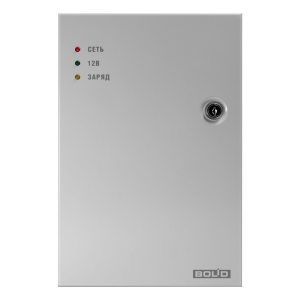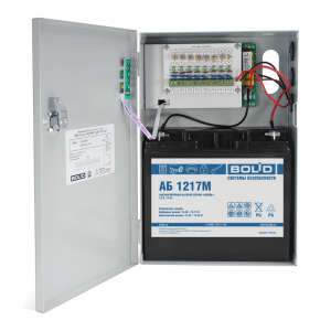 Резервированный источник питания; U-пит.150…265 В, U-вых.13.6 В, I-вых.5 А, восемь выходных каналов с максимальным током до 1 А; под АКБ 12В 17 А·ч; защита от КЗ и глубокого разряда; IP30, t-раб.-10…+40°С, 295х195х90 мм