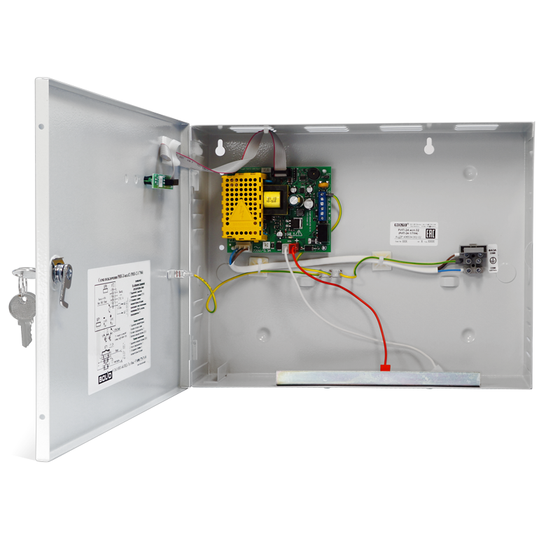 Резервированный источник питания; U-вх.187…250 В, U-вых.25.8…28.2 В, I-ном.1 А, I-max.1,5 А (до 10 минут), под два АКБ 12 В 7 А·ч; световая и звуковая индикация режимов работы, диагностический выход "Переход на резервное питание" типа "открытый коллектор", защита от короткого замыкания, защита аккумулятора от глубокого разряда; IP20, t-раб.-10…+40°С, 340х270х100 мм