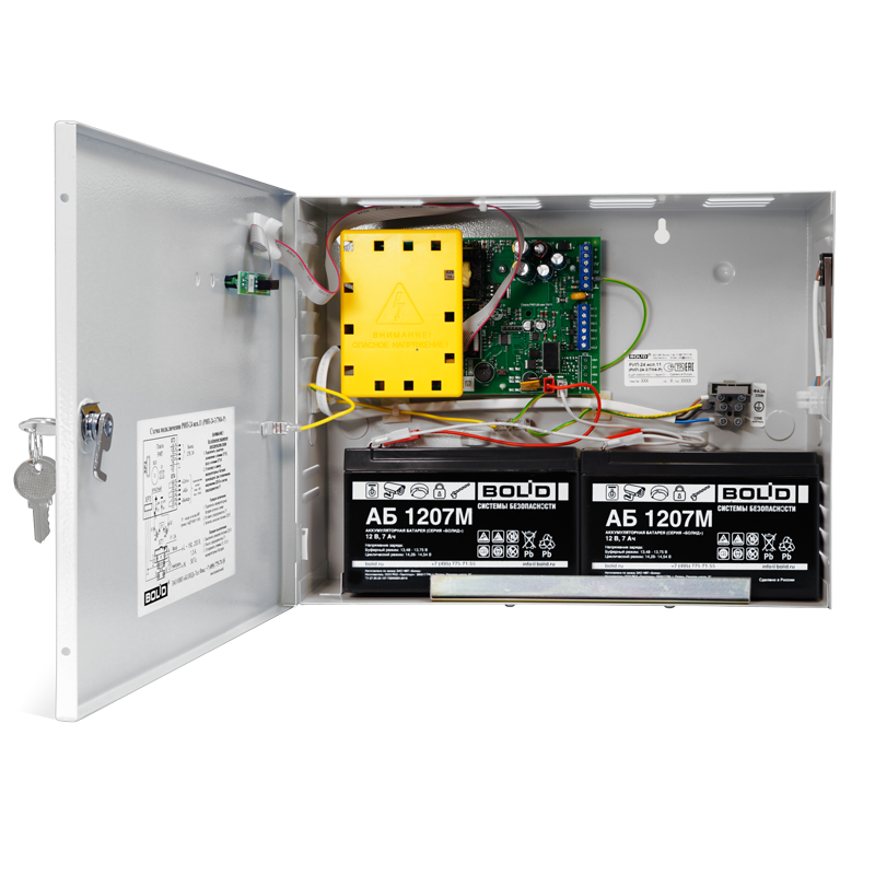 Резервированный источник питания; U-вх.187…250 В, U-вых.26.6…27.8 В, I-ном.3 А, I-max.4 А (до 10 минут), под два АКБ 12 В 7 А·ч; световая и звуковая индикация режимов работы, три оптоэлектронных диагностических выхода, защита от короткого замыкания, защита аккумулятора от глубокого разряда; IP20, t-раб.-10…+40°C, 340х270х100 мм. Возможность подключения бокса на два аккумулятора 12 В 17 А·ч (Бокс-24 исп.0)