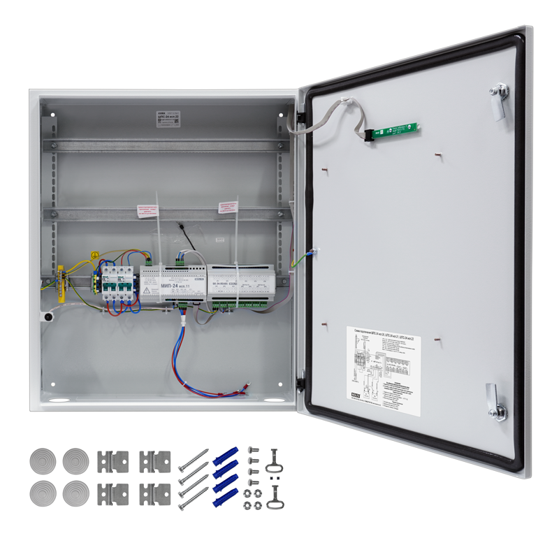 Шкаф для монтажа средств пожарной автоматики с креплением на DIN-рейку; 2 ввода питания; U-вх.180…265 В, U-вых.27.2±6 В, I-ном.3 А, I-макс.3.5 А, под два АКБ 12 В 26/40 А·ч; встроенный блок коммутации БК-24-RS485 (две изолированные линии интерфейса RS-485 для подключения к компонентам ППКП и ППКУП расположенным за пределами ШПС, одна линия RS-485 для подключения компонентов ППКП внутри ШПС; 7 выходов для подключения к приборам внутреннего интерфейса RS-485 и 7 выходов питания; IP54, t-раб.-10…+40°С, 700×600×225 мм. Возможность установки монтажного комплекта МК-1.