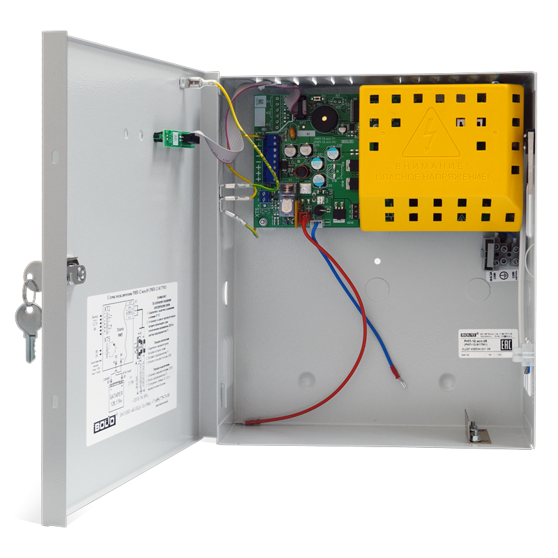 Резервированный источник питания; U-вх.150…250 В, U-вых.13…14.2 В, I-ном.8 А, I-max.10 А (до 10 минут), под АКБ 12 В 17 А·ч; световая и звуковая индикация режимов работы, диагностический выход "Переход на резервное питание" типа "открытый коллектор", защита от короткого замыкания, защита аккумулятора от глубокого разряда, t-раб.-10…+40°С, 255х310х95 мм. Возможность подключения бокса на два аккумулятора 12 В 17 А·ч (Бокс-12 исп.0)