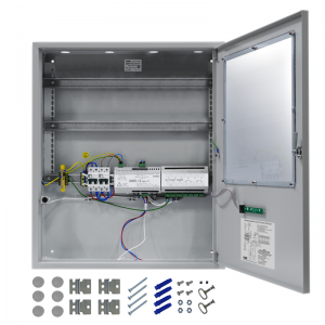 Шкаф для монтажа средств пожарной автоматики с креплением на DIN-рейку; 2 ввода питания; U-вх.180…265 В, U-вых.13.6±6 В, I-ном.5 А, I-макс.5.5 А, под два АКБ 12 В 26/40 А·ч; встроенный блок коммутации БК-12-RS485 (две изолированные линии интерфейса RS-485 для подключения к компонентам ППКП и ППКУП расположенным за пределами ШПС, одна линия RS-485 для подключения компонентов ППКП внутри ШПС; 7 выходов для подключения к приборам внутреннего интерфейса RS-485 и 7 выходов питания; IP41, t-раб.-10…+40°С, 700×600×225 мм. Дверь с прозрачным стеклом.
